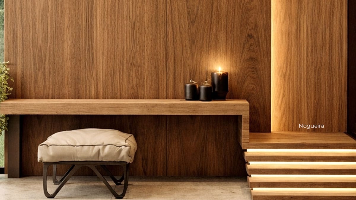 A lâmina de madeira natural se encaixa perfeitamente nessa lógica. Ela não tenta ser madeira: ela é madeira. E isso muda completamente a forma como o ambiente é percebido.